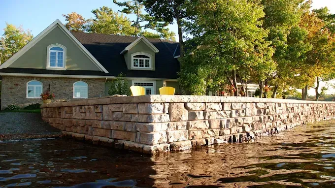 Rockwall and seawall systems installed to resist erosion and protect property from wave-driven shoreline loss